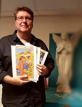 Over de kaartlegger Mijn naam is John Hagen. Ik ben geboren in 1963 in het mooie plaatsje 's-Graveland. Zo rond mijn 21e maakte ik kennis met de tarotkaarten. Hoewel ik de kaarten héél boeiend vond, heb ik er toen niets mee gedaan. In mijn gedachten was ik er vaak mee bezig en hielden de tarotkaarten mij subtiel in hun greep. Zo rond de eeuwwisseling kwamen ze opnieuw op mijn levenspad. Het was alsof een stem zei; ”Het is tijd”. Ik voelde de uitdaging en voordat ik het wist stond ik buiten de winkel en had ik mijn eerste tarotkaarten gekocht. Voor familie en vrienden die het écht wilden, vroeg ik de kaarten om inzichten om inzichten te krijgen over hen levenssituatie. Door de enthousiaste reacties werden tarotkaarten al snel een verlengstuk van mijn wezen, mijn zijn. Ik kreeg steeds meer feeling met de tarotkaarten en al snel kwamen er cliënten voor consulten bij mij thuis. Vervolgens ontdekte ik dat ik ook op een andere manier verbintenis met de kaarten kreeg. Via de hofkaarten voelde ik dat er contact met me werd gezocht. Terwijl ik uitleg gaf over de kaart, gebeurde er met mij steeds meer. Ik kreeg de pijntjes aan te voelen van een overleden persoon die zich in één van de hofkaarten manifesteerde. De overleden personen lieten zich dingen van mezelf aanvoelen of zijn gaven hun bewoordingen die ik moest overbrengen. Dit er bevestiging dat de overleden dierbare werkelijk aanwezig was om mijn cliënt te helpen door een moeilijke levensfase heen te komen. Ik ben dankbaar en het maakt me gelukkig dat ik via de tarotkaarten een doorgeefluik mag zijn om persoonlijke boodschappen van overledenen door te geven.